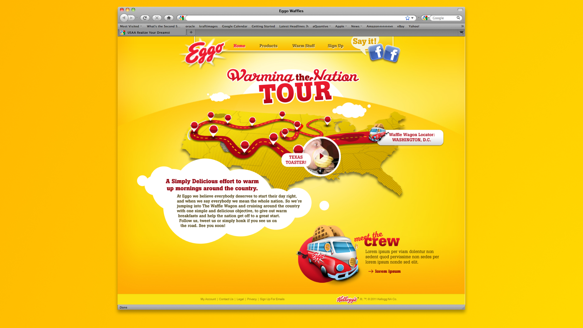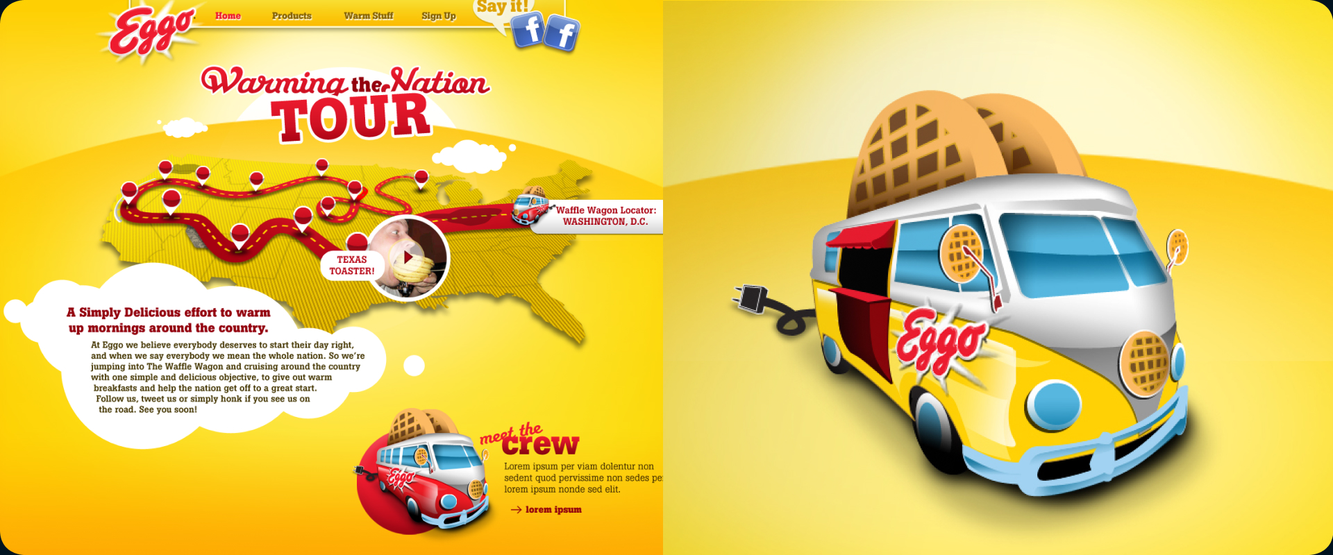 Eggo carries household name recognition across the United States but needed a new jolt of energy after several years of parent company attention to other portfolio brands. Our team at Razorfish concepted a fun new way to get customers back on the wagon: a literal waffle wagon. We devised a cross-country tour for Eggo fanatics to track the wagon as it made its way from New York City, across to California and back, and plan an encounter to get a free waffle breakfast. Our website also encouraged users to upload examples of their favorite way to eat an Eggo for a chance to win sweepstakes prizes.