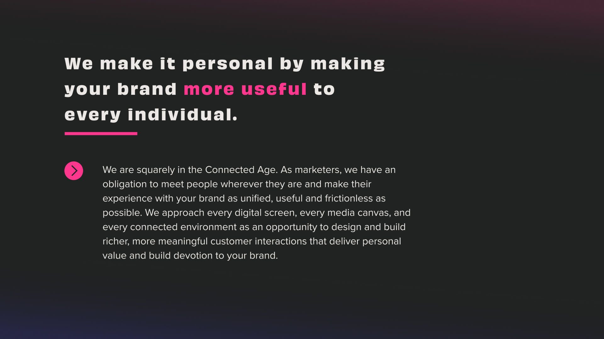 At LC, I lead the connected experiences team, which combines experience design and engineering underneath a single departmental vision. I’ve had an opportunity to define and build an entire new practice, consisting of everything from setting team levels and structure, creating a vision and benchmarked goals for the team, championing and evangelizing team accomplishments, crafting thought leadership, and of course driving A-level work for our existing clients and potential new partners.