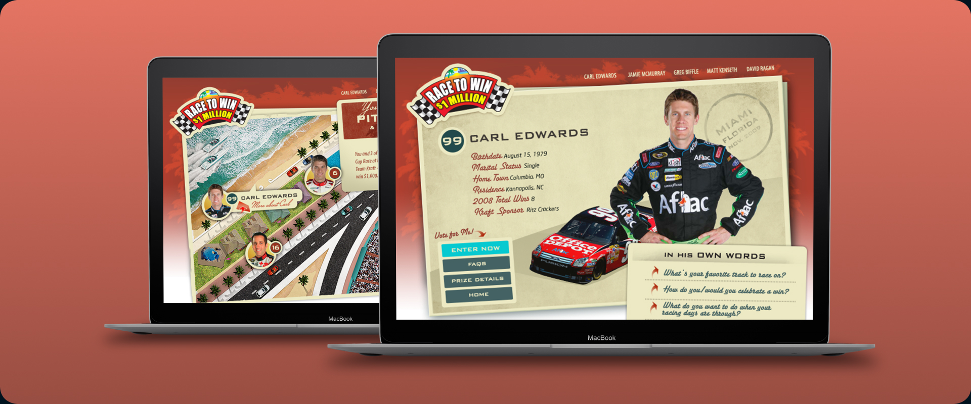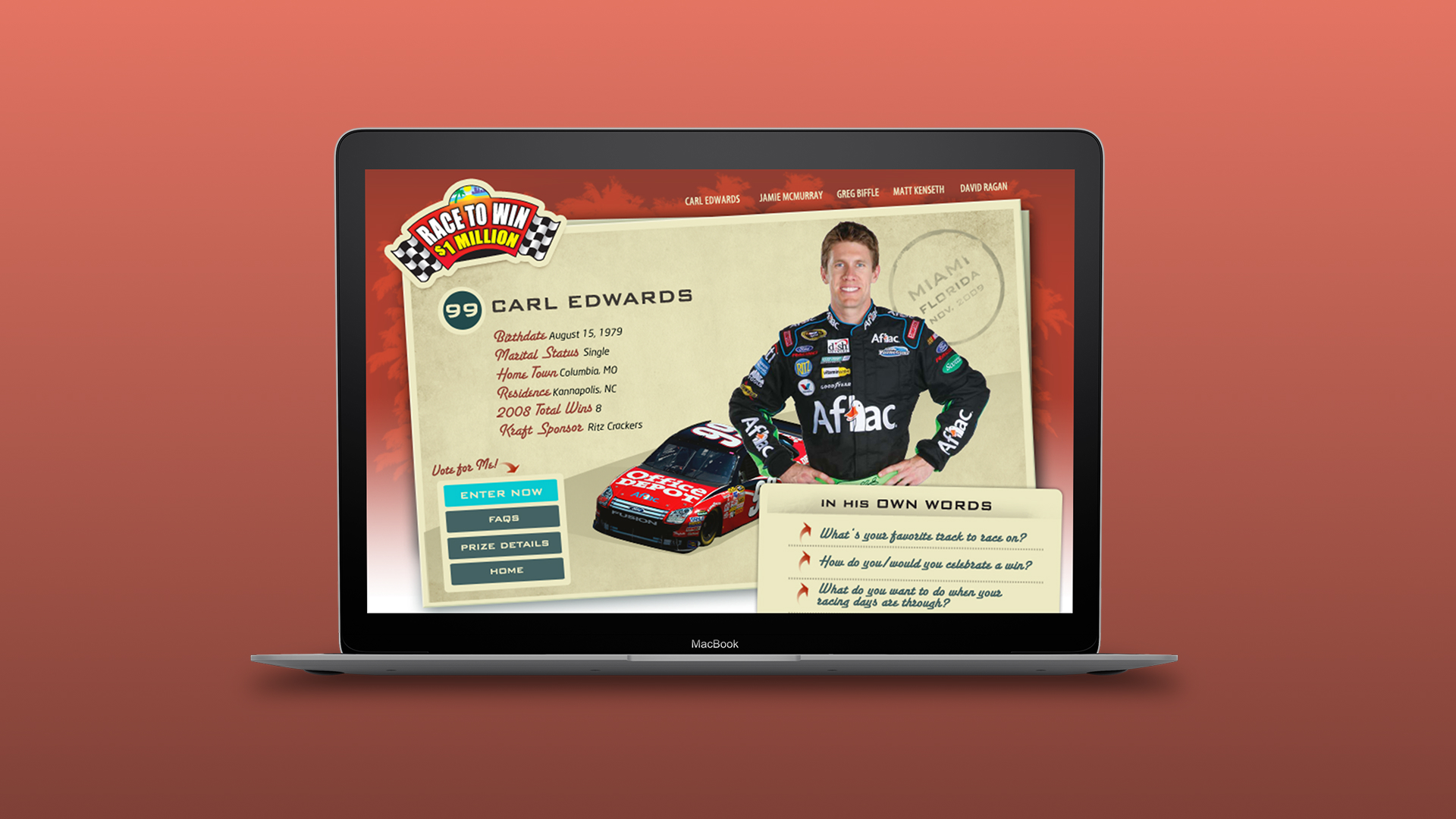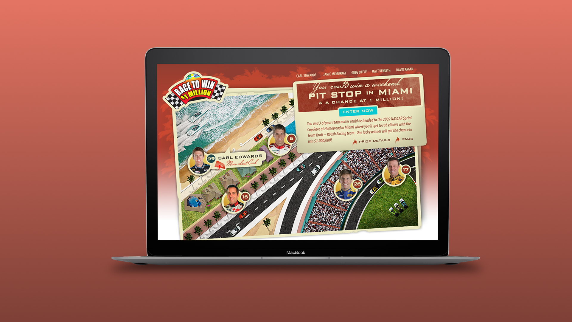 Nascar has always prided itself as a sport for the fans. The Nascar faithful have access to cars, tracks and drivers in a way most other professional sports won’t entertain. In 2009, Our team at Razorfish Chicago supported a Kraft relationship with Nascar to launch a brand-new promotion. Fans could enter a sweepstakes to win a trip to Homestead, Florida for the Nascar Sprint Cup to meet their favorite Team Kraft drivers and have an additional chance at winning $1 million.