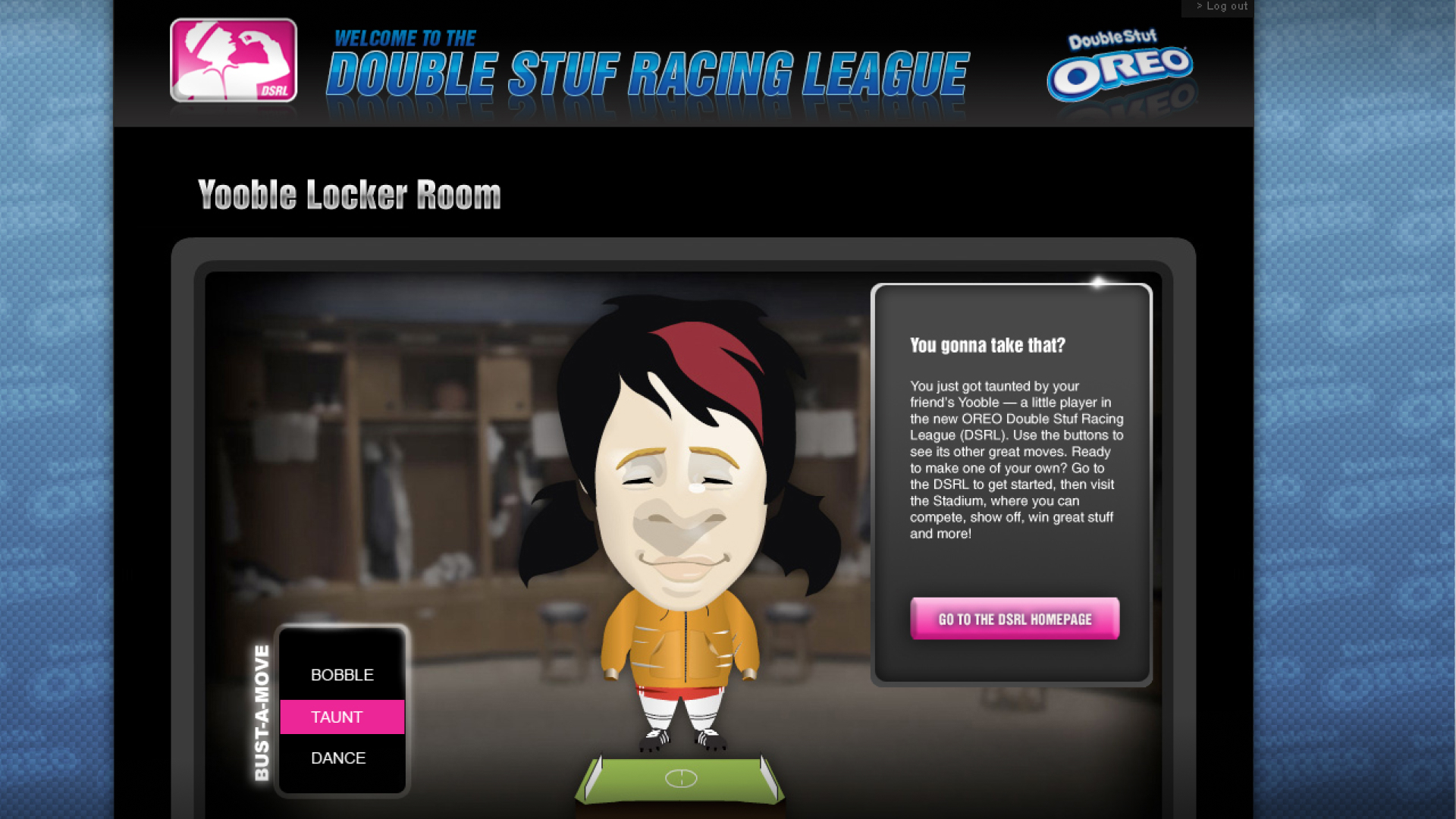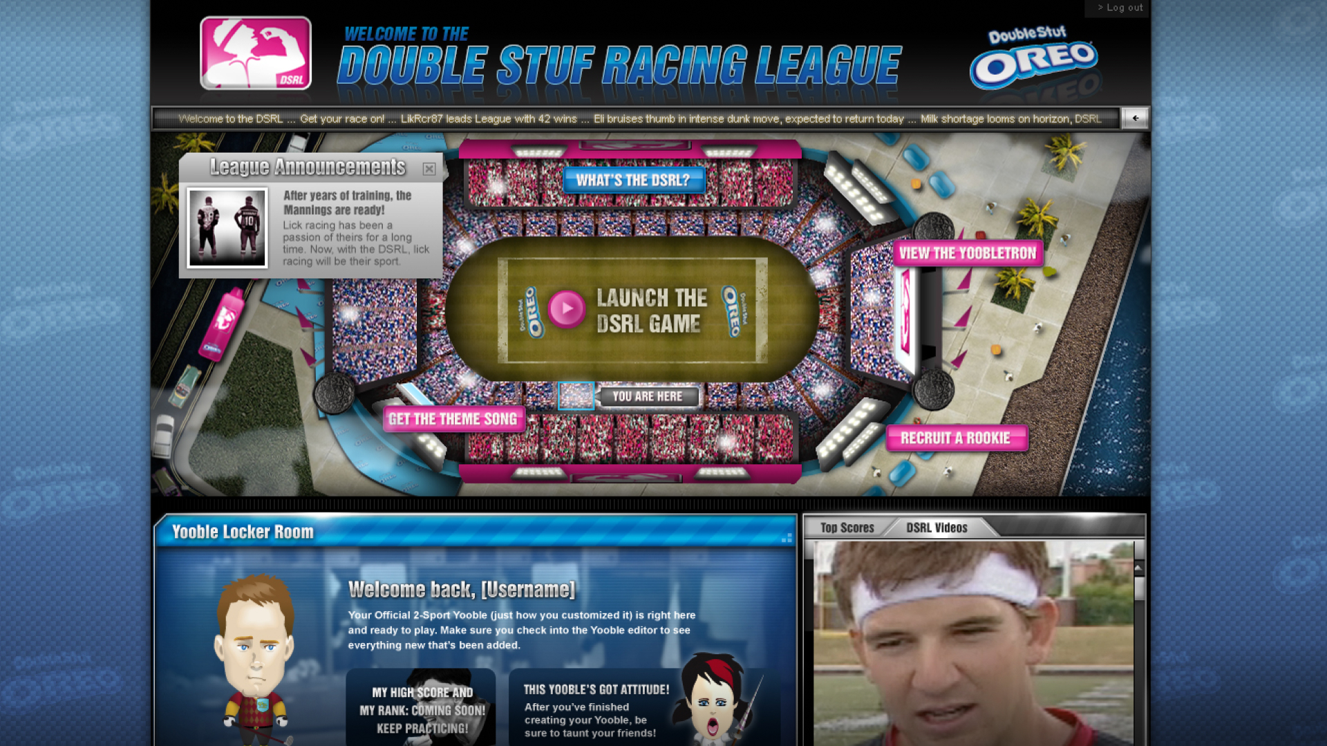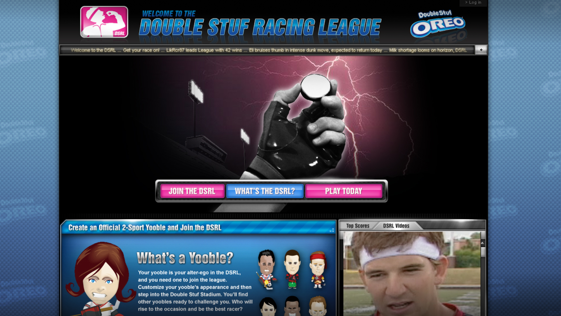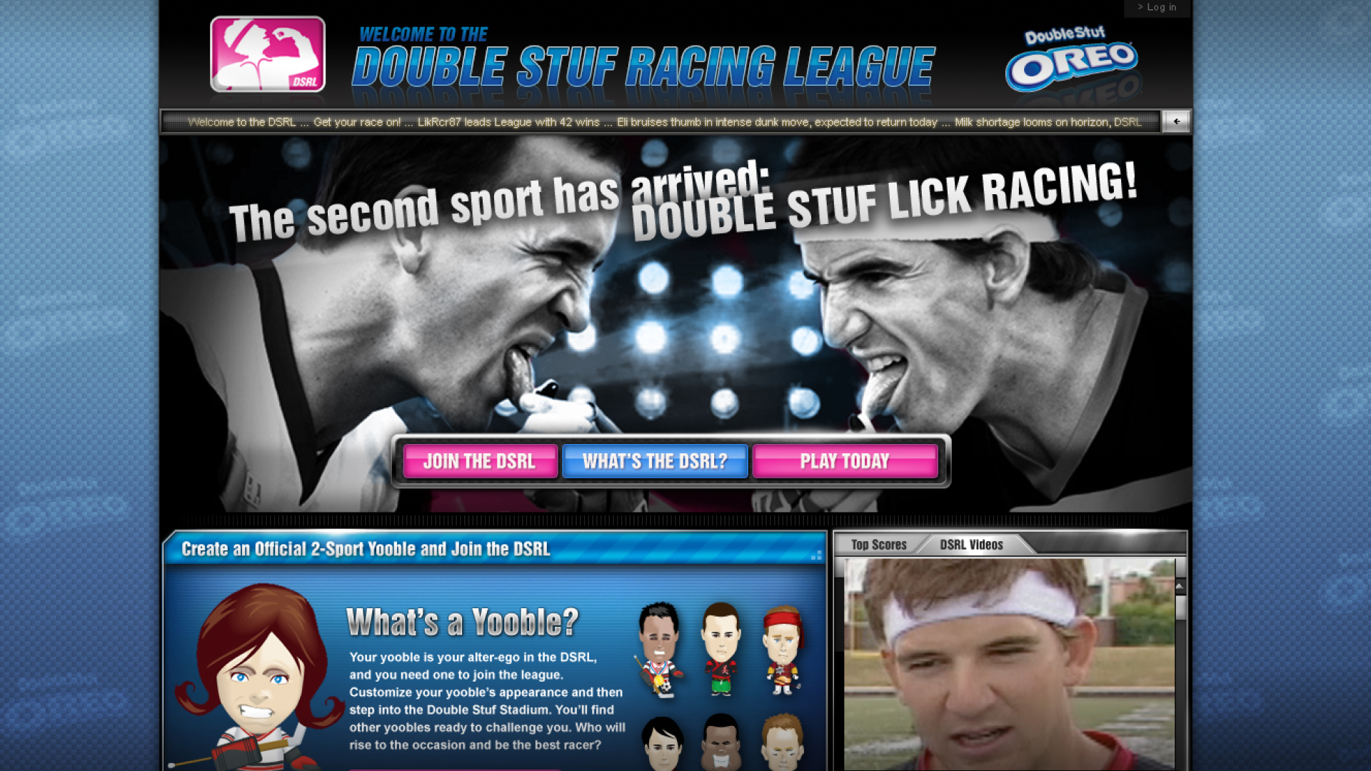 So, we did. We engineered a country-wide cookie craze by creating an entirely new sports league—dubbed the DSRL—themed around Double Stuf cooking lick-racing. I led the team that built the DSRL stadium and positioned it to welcome excited users to Manning-themed promotions, lick-raced cookie games, and fun Avatars they could create to participate in the digital league.